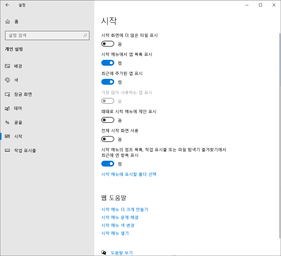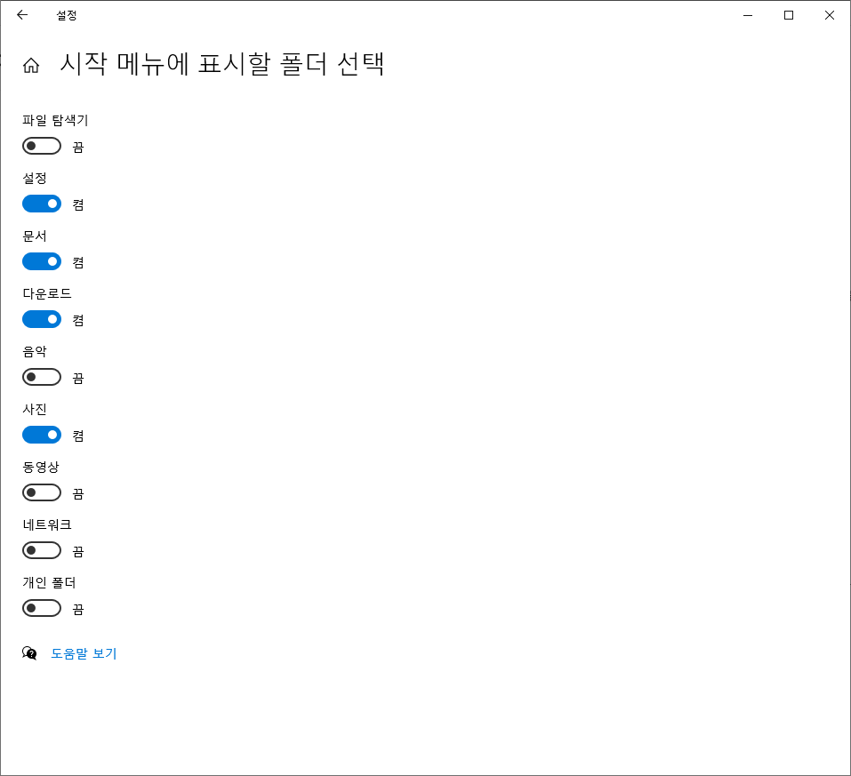 2. 시작 - 시작 메뉴에 표시할 폴더 선택
